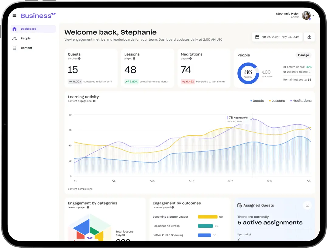 Mindvalley provides an innovative learning platform for personal transformation, and our business membership expands upon this by offering an organizational solution tailored to facilitate growth for individuals, teams, and companies. Mindvalley cultivates a growth-oriented mindset among individuals and teams by emphasizing holistic well-being and fostering balanced development across all aspects of life. Through various Business plans, organization members gain access to quests, programs, workshops, live sessions, and calls, enabling teams to track progress both at the individual and organizational levels.