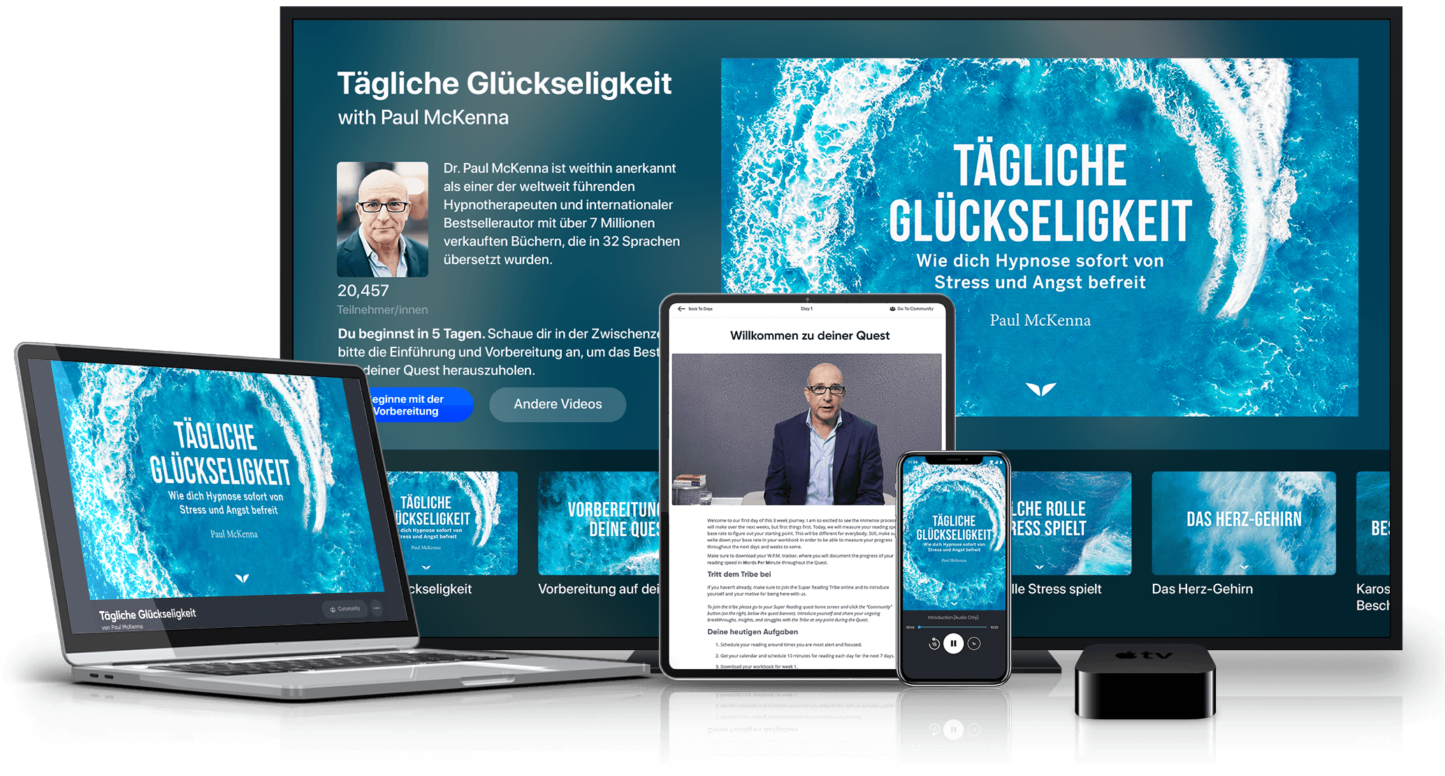 Der Kurs Tägliche Glückseligkeit mit dem Star-Hypnotherapeuten Paul McKenna bestärkt dich darin, deine Reaktion auf Stress neu zu programmieren, damit ein bedingungslos positiver Geist, entspannter Körper und ein insgesamt glücklicheres und produktiveres Leben dein neuer Normalzustand wird.