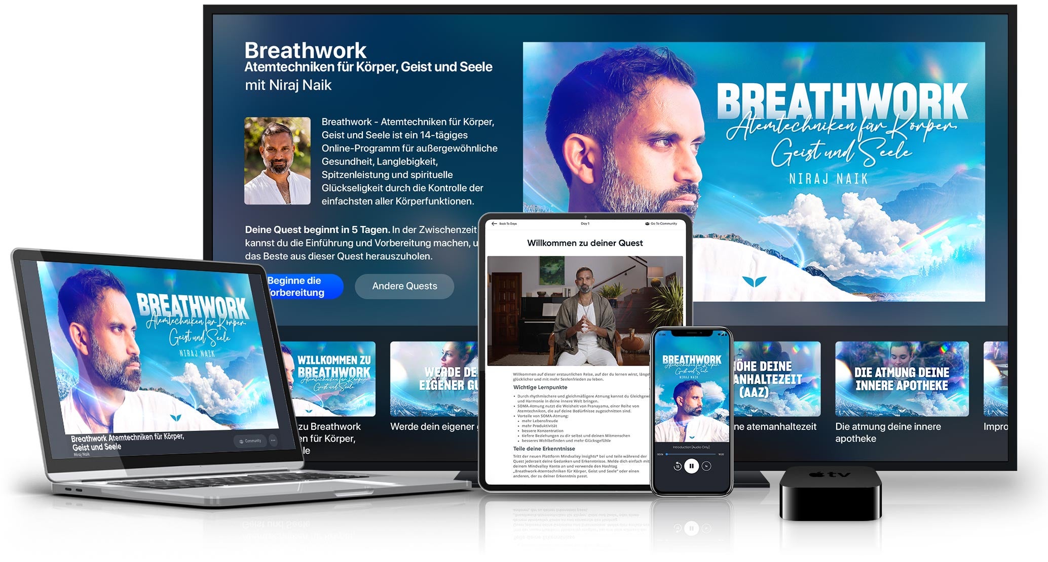 Breathwork - Atemtechniken für Körper, Geist und Seele ist ein 14-tägiges Online-Kurs für außergewöhnliche Gesundheit, Langlebigkeit, Spitzenleistung und spirituelle Glückseligkeit durch die Beherrschung der einfachsten aller Körperfunktionen. Jeden Tag wirst du mit dem Gründer der SOMA-Atmung, Niraj Naik, eine intensive, kurzweilige Lerneinheit absolvieren, in der er dich durch die charakteristischen SOMA-Atemtechniken, Meditationen und feinen Veränderungen des Lebensstils führt, die deinen Atem in eine unerschöpfliche Quelle der Heilung und des Wohlbefindens verwandeln. Im Laufe des Kurses wirst du schnell feststellen, dass eine optimale Atemarbeit nicht schwer ist: Wenn du die richtigen, aufeinander aufbauenden Schritte befolgst, wird sie dir so mühelos und natürlich gelingen, als hättest du dein ganzes Leben lang so geatmet. Am Ende des Kurses wirst du eine dauerhaft veränderte Beziehung zu deinem Atem haben: und ein ganzes Arsenal an Techniken und Übungen, die du ein Leben lang anwenden wirst, um in ein besseres Ich zu atmen.