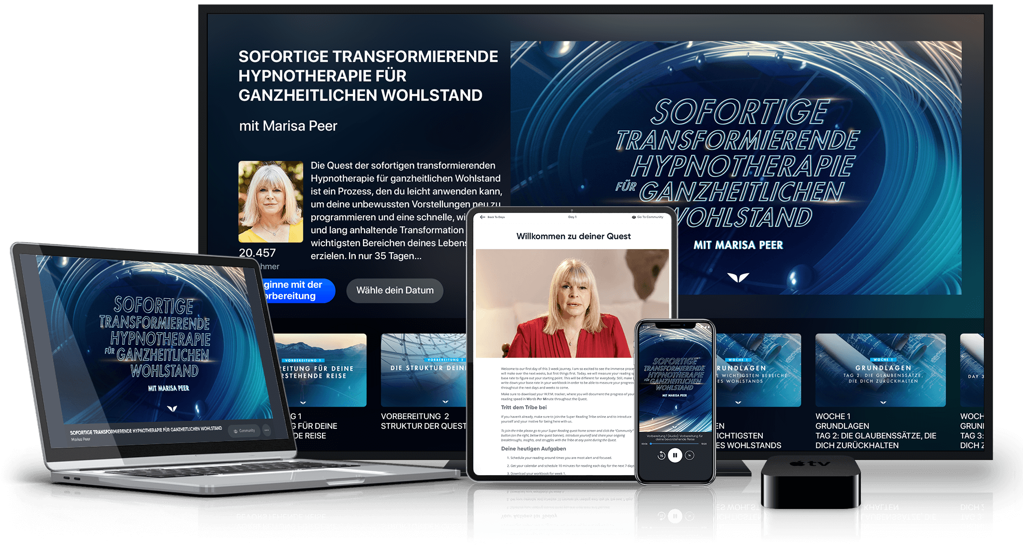 Ob während ihrer berühmten Masterclass, einer ihrer vielen Vorträge bei Events wie dem A-Fest, Mindvalley-Treffen oder der Mindvalley University, Marisas lebensverändernde Reden stehen ganz oben auf der Beliebtheitsskala. Die Quest Sofortige Transformierende Hypnotherapie für ganzheitlichen Wohlstand bietet dir die Möglichkeit, Marisas berühmtestes Modul kennenzulernen und deine inneren Blockaden zu überwinden, die dich vom ganzheitlichen Wohlstand abhalten. den du verdient hast.
