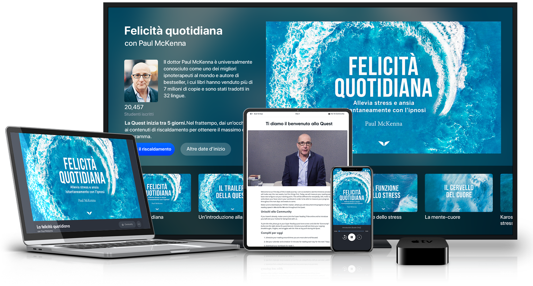Il programma Felicità quotidiana, con il celebre ipnoterapeuta Paul McKenna, ti darà il potere di riprogrammare il modo in cui il tuo corpo e la tua mente reagiscono allo stress, così che tu possa raggiungere una nuova normalità fatta di pensieri positivi, relax fisico e una vita più felice e produttiva.