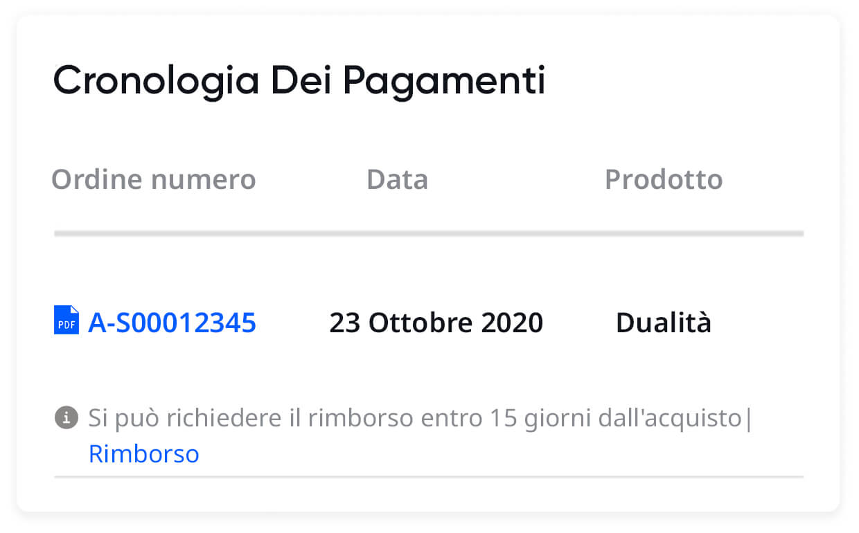 La qualità dei nostri prodotti parla da sé, per questo non abbiamo remore ad offrire un rimborso completo. I nostri studenti possono richiedere il rimborso automatico di qualsiasi programma, per qualunque ragione, entro 15 giorni dall’acquisto, basta un clic. Sei sempre al sicuro.