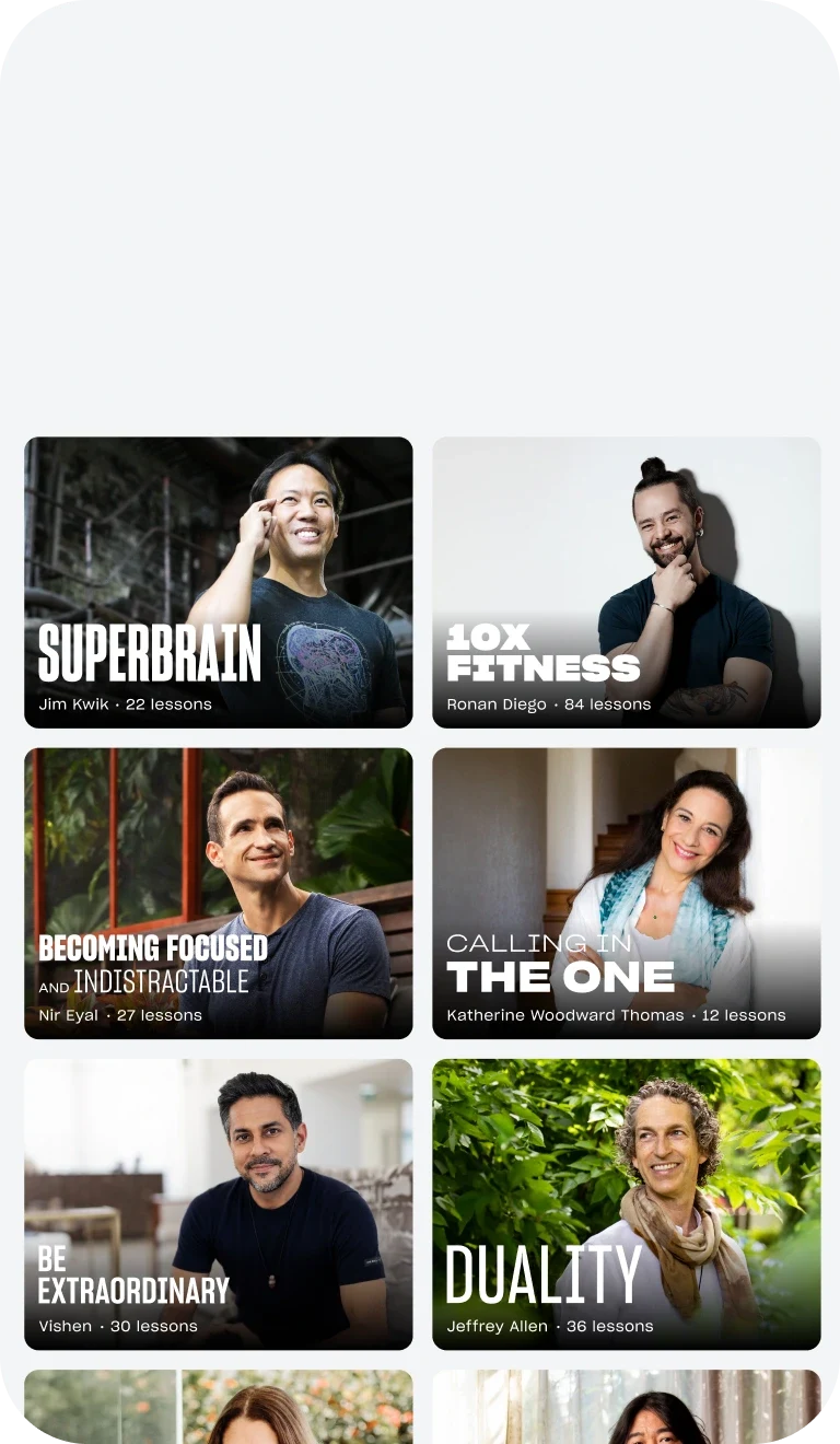 Curated experiences across abundance, longevity, emotional mastery, leadership, spirituality, and more