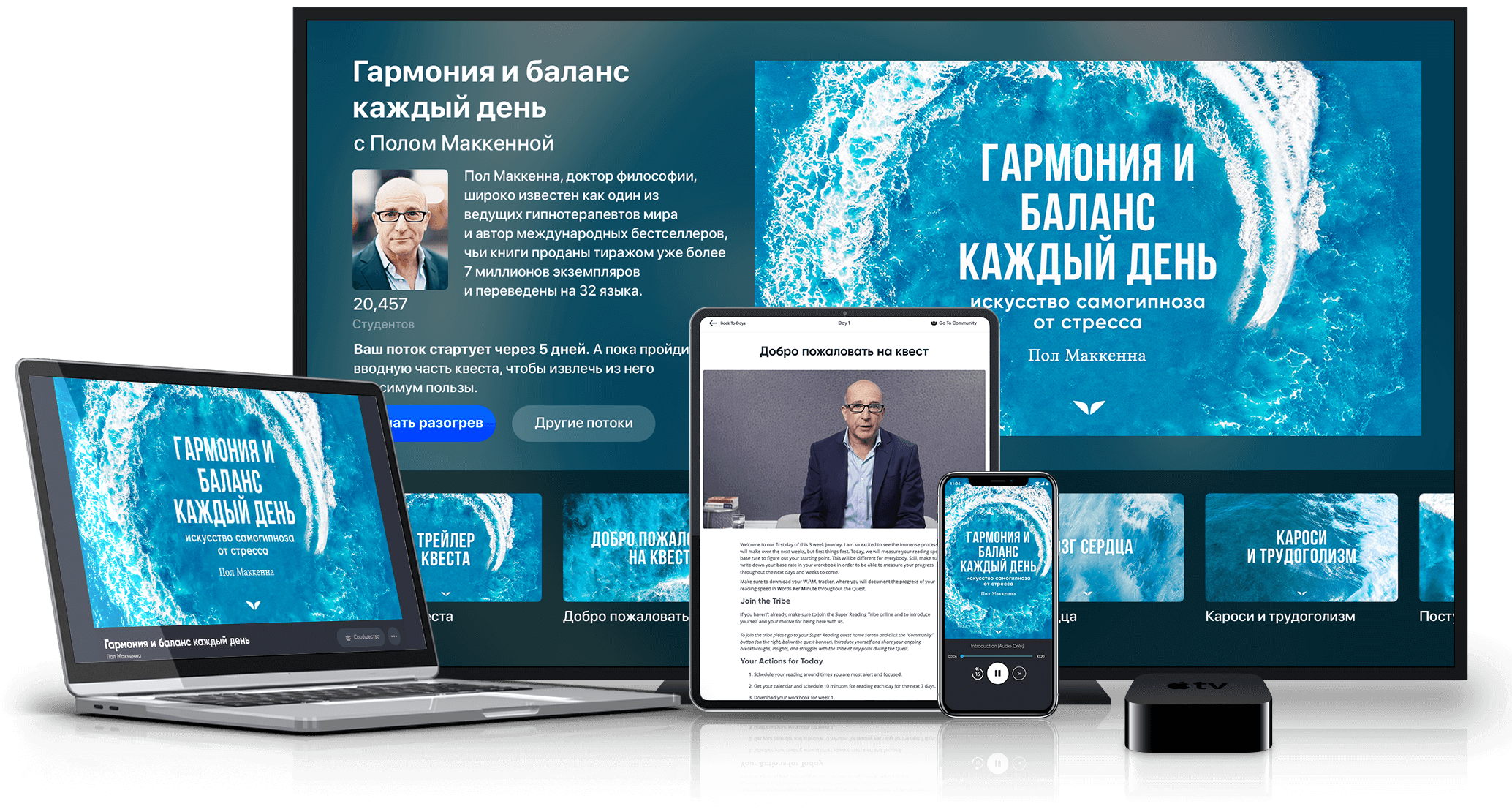 В ходе квеста «Гармония и баланс каждый день» от всемирно известного гипнотерапевта Пола Маккенны вы научитесь изменять реакцию своего тела и сознания на стресс, чтобы на смену перегрузкам, страху и тревогам в вашу жизнь пришли хорошее настроение, умиротворение, счастье и продуктивность.
