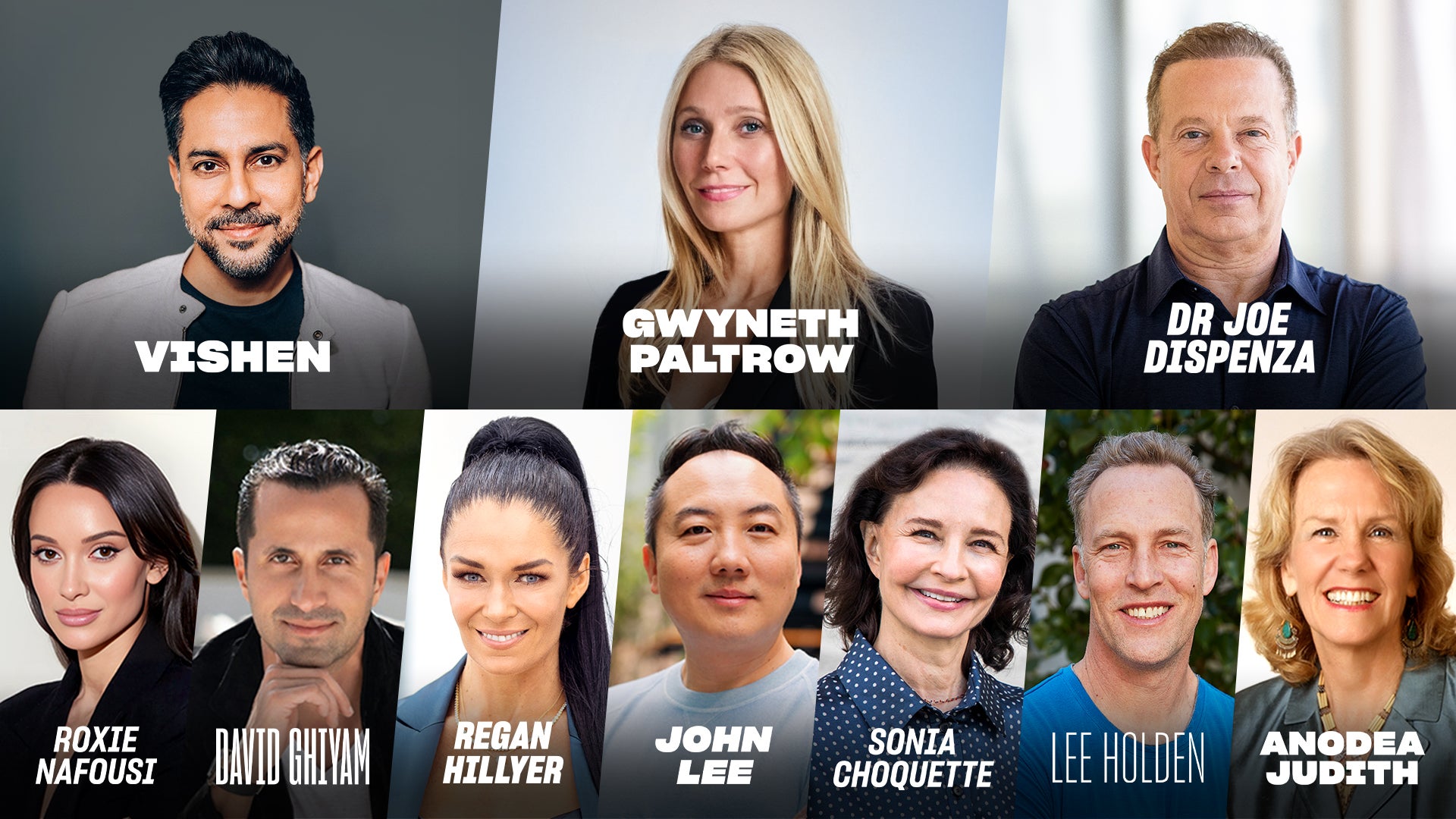 Sonia Choquette (Intuitive guide), Anodea Judith (Author of Mindvalley's Chakra Healing), John Lee (Entrepreneur), David Ghiyam (Wealth consciousness mentor), and Lee Holden (Qi Gong master).